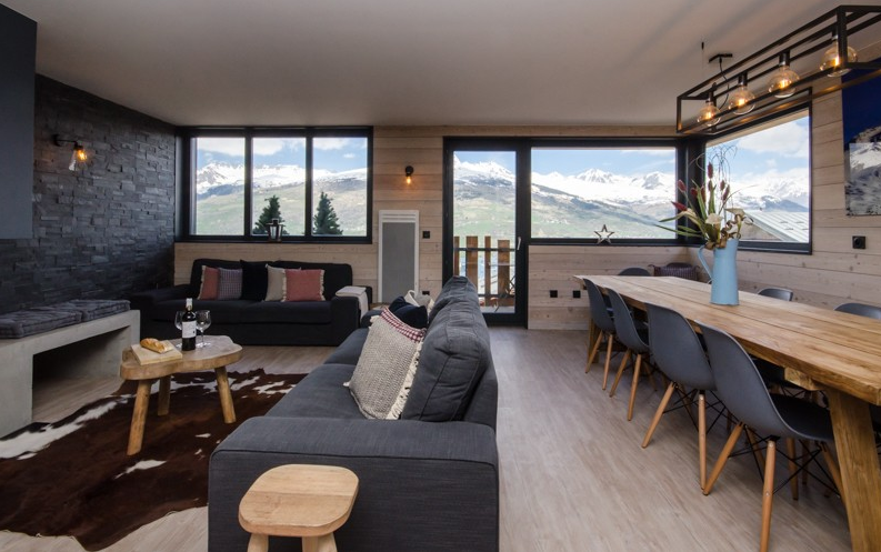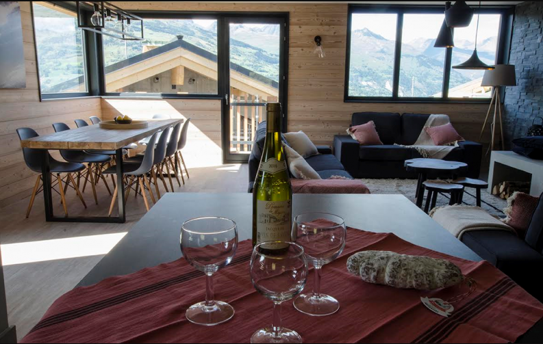 The chalet has been constructed in keeping with the village and the local area; wood cladding on the outside with stonework on the ground floor. The interior is very modern using subtle colours to give a contemporary and homely feel. There are great views from the lounge and dining area offering superb views across the Tarentaise valley with Mont Blanc in the distance. With the balcony ideally placed at sunset, where better to enjoy a pre-dinner drink before your 4-course meal.