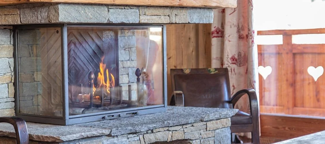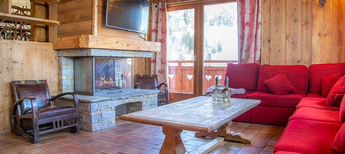 Lounge with a fireplace, comfortable sofas and large balcony overlooking the Tarentaise Valley and the slopes