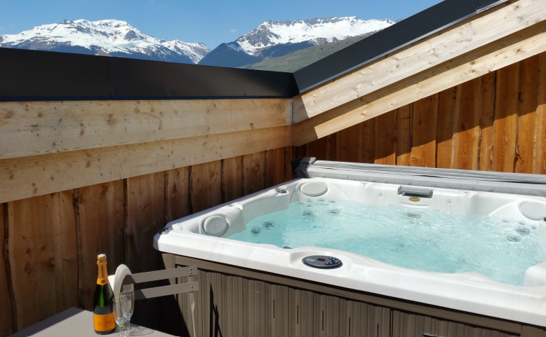 Myrtille has a super view, with an open living/dining area that overlooks the village, Tarentaise Valley and Mont Blanc. Alongside a stunning log fire, there’s also a balcony and roof top hot tub for you to enjoy a drink or three while you take in the views and atmosphere.