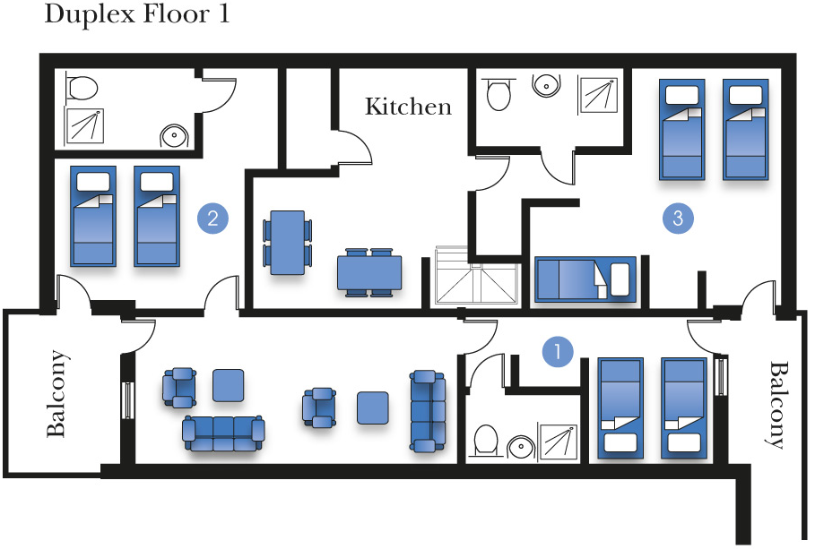 Room 1 - Twin with en suite shower, WC & shared balcony