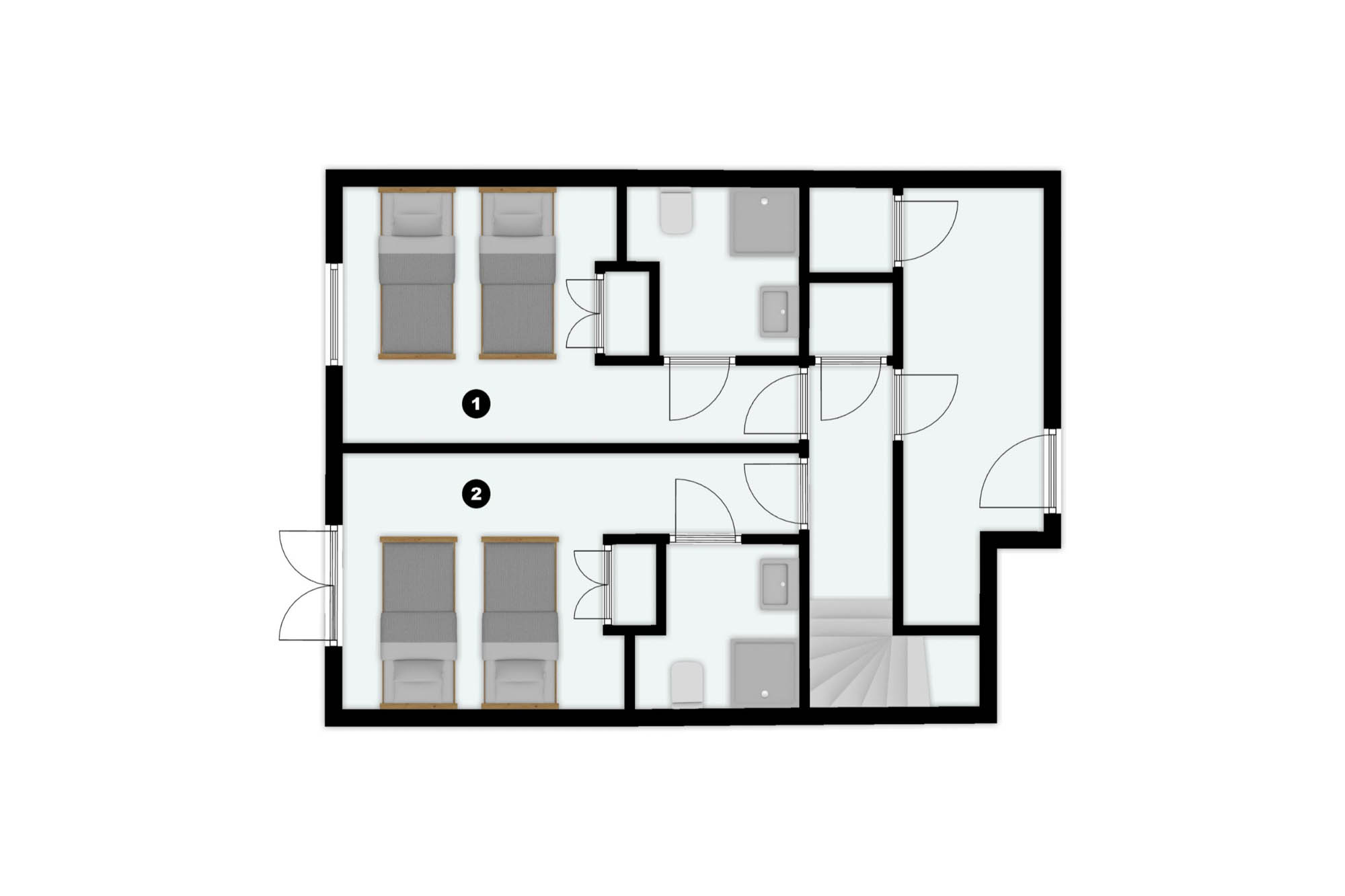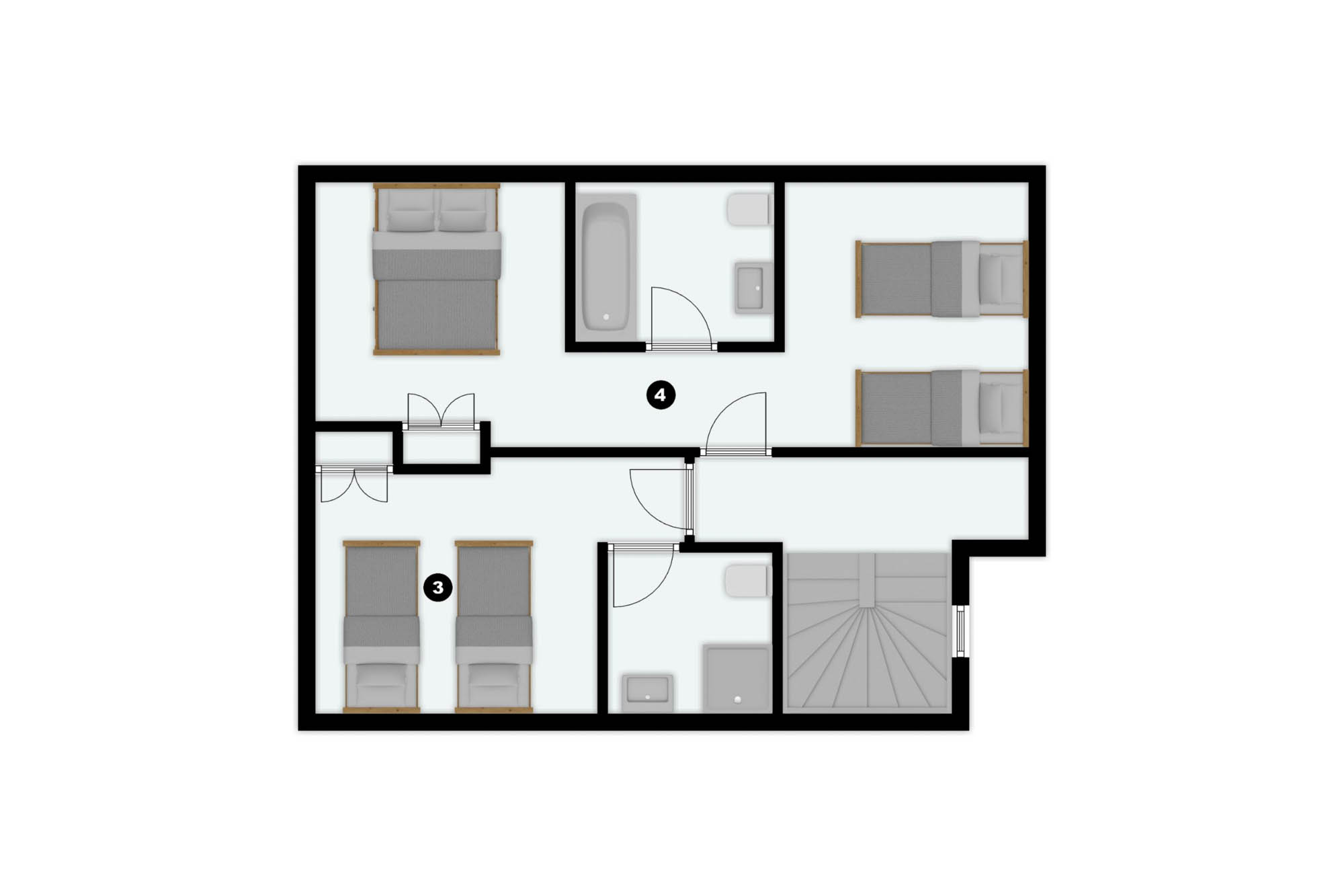On the ground floor there are two ensuite twin rooms. On the first floor is the kitchen, dining area and lounge with a fireplace and doors to the balcony sharing fabulous views of the piste with the hot tub and sauna located in the top garden. Wrap around glass windows give a fabulous view of the ski run back home. On the next floor is two rooms, a quad with 2 sets of twins separated by the bathroom, ideal for a family and another twin ensuite. On the top floor, Chalet Snowflake offers another spacious family room with 5 single beds. In the hall are some sofas for a small additional space to relax in. All twins can be adapted for couples by pushing the beds together.