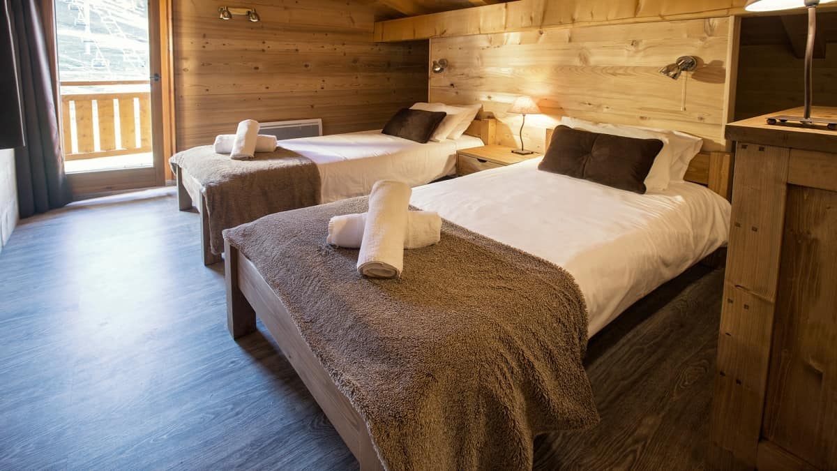 The open plan lounge and dining area of Chalet Sorbier 2 benefit from large French windows and a balcony with views onto the adjacent piste and to the Plagne 1800 chairlift - perfect for checking out the weather over breakfast. The spacious lounge area has ample, comfortable seating and a glass-fronted log-burning fire for the nights when you feel like staying in to enjoy this idyllic setting. There are 3 spacious bedrooms, two twin rooms and a double, which allow the chalet to sleep up to six people.