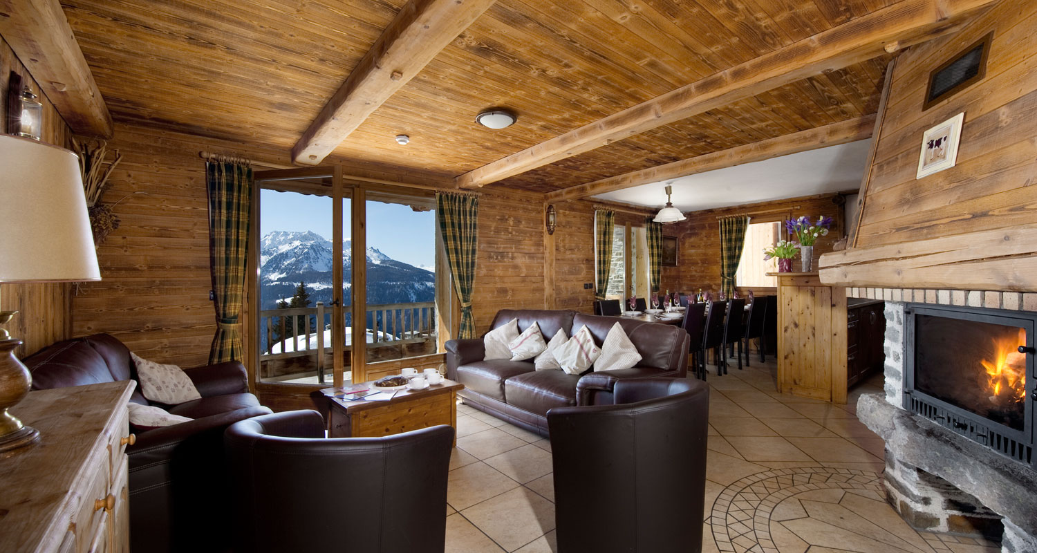 There is a comfortable open plan dining and lounge area, complete with a large stone fireplace, beamed ceiling and large picture windows leading to the balcony, with fabulous views over the Tarentaise valley. The three family rooms have two separate sleeping areas, as well as their own en suite or private facilities. In addition there is a separate twin room between two of the suites, so it's perfect for larger family groups booking both for 6.