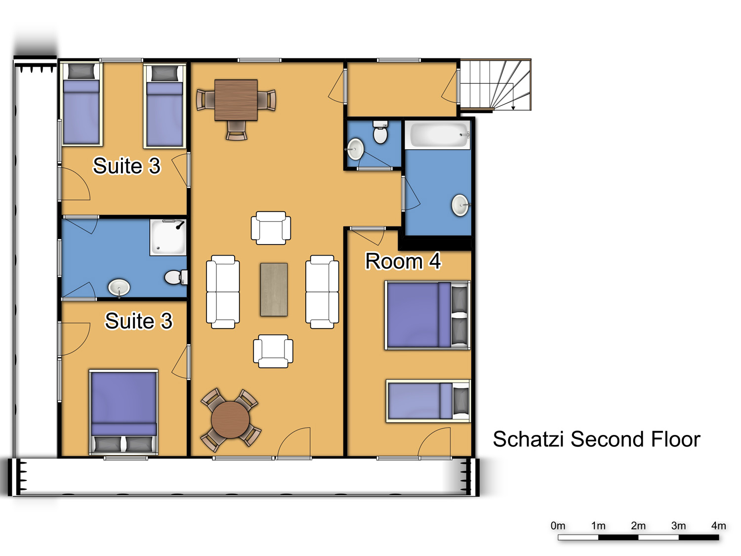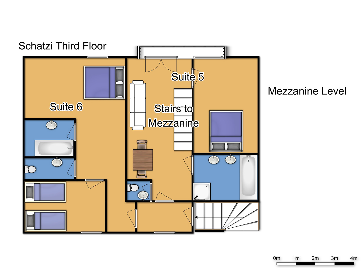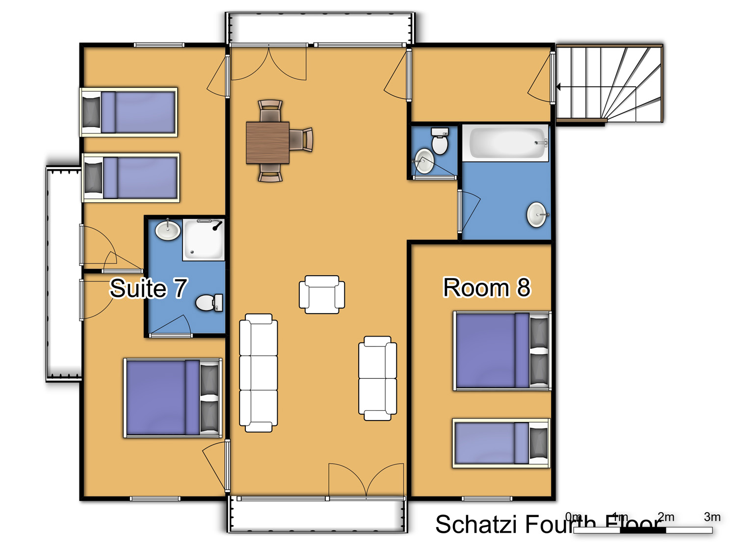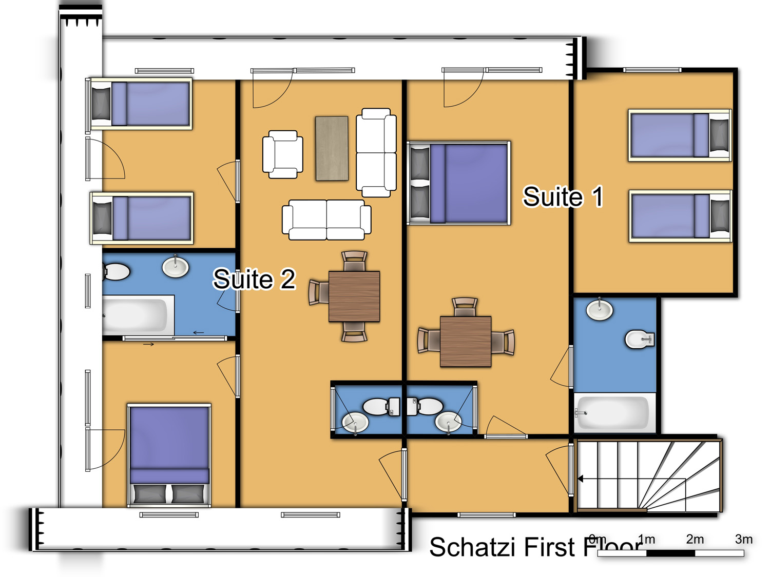 Early booking is recommended! Entrance to the Schatzi’s bedrooms is via a central staircase with an external code-locked entrance to the communal areas.