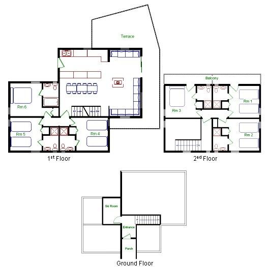 The ground floor of the chalet comprises the entrance hall and boot room with heated boot warmers. On the first floor there are three en-suite bedrooms (two twins and a double), along with the open plan living and dining area which has access to large, south-west facing terrace. On the second floor there are a further three en-suite bedrooms (two twins and a double).
