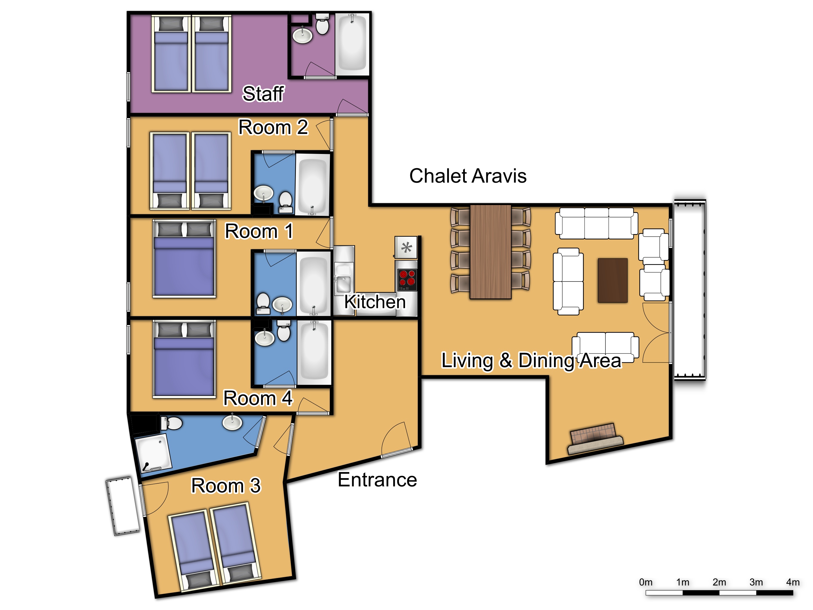 The Chalet Aravis apartment is run separately by your own dedicated Chalet Host, and is comfortably fitted and furnished, with open-plan living/dining area, all with a crackling log fire to create a warm and welcoming atmosphere, a balcony, and also a TV. Additionally this season there will be free Wifi access.