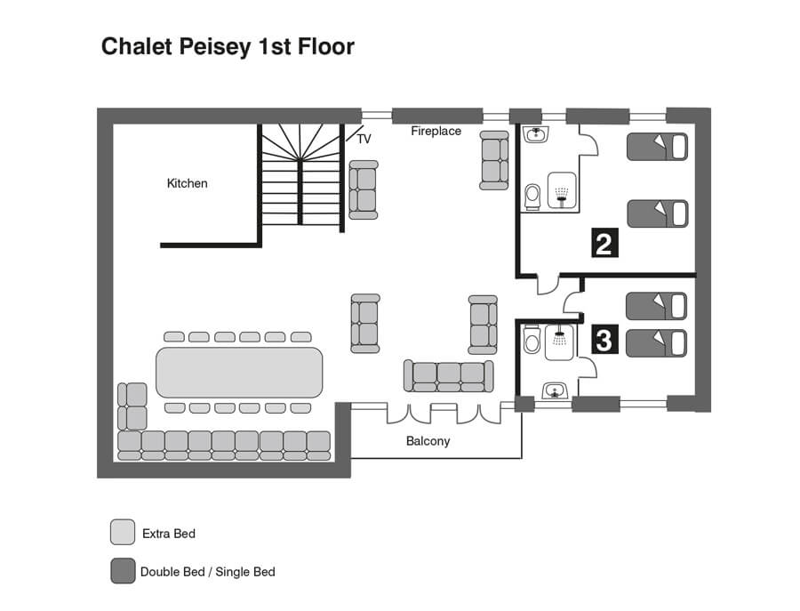 The accommodation is extremely light, thanks to its large picture windows and is laid out over 3 floors. The large open plan dining/living room showcases a double height cathedral style ceiling, a sizeable open fireplace and spectacular views. Overlooking the living room is a mezzanine level with pool table, satellite TV, DVD and games console. An impressive sunny balcony runs half the length of the chalet on the first and second foors.