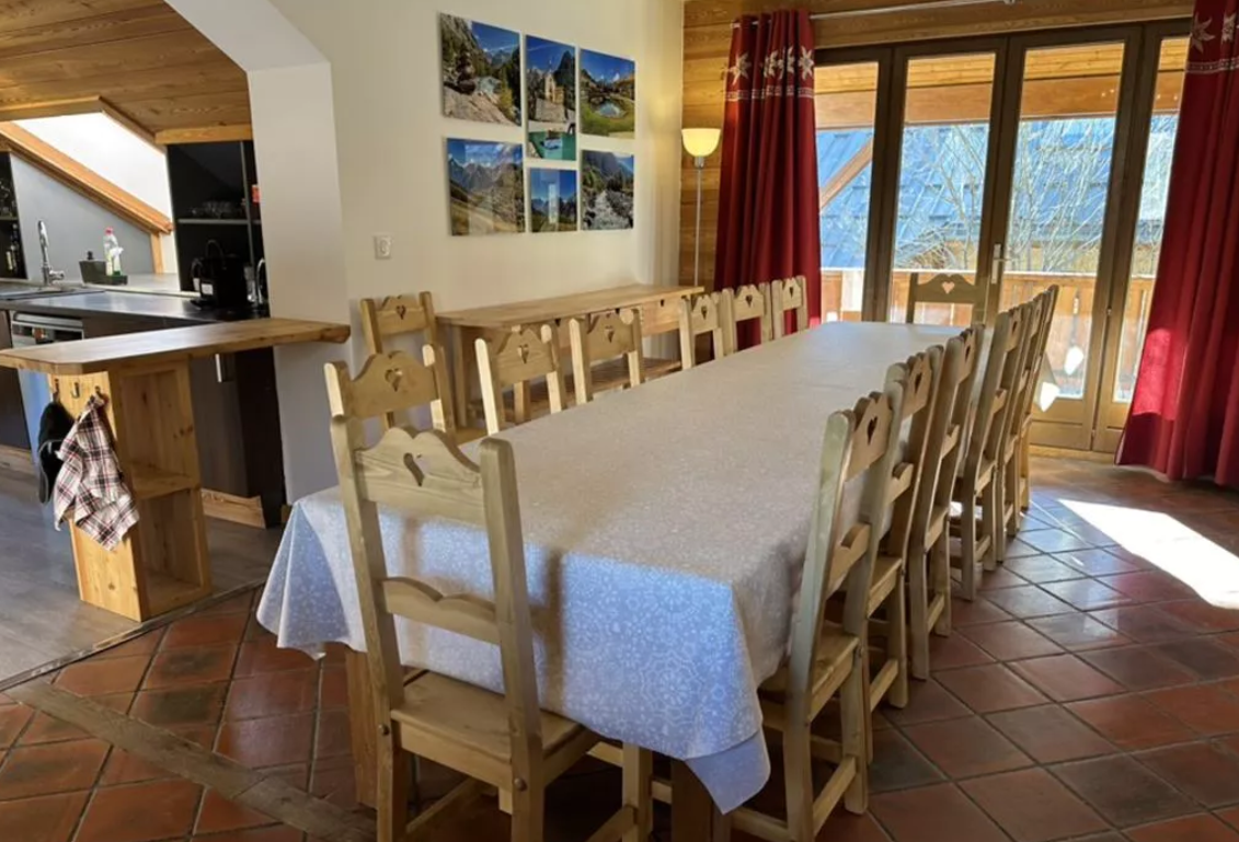 This traditional chalet in Les Deux Alpes has been renovated using modern, stylish furnishings and fittings meaning you have the best of both worlds. You can enjoy putting your feet up in front of the fire in the cozy lounge on the large, leather sofas or taking in the panoramic views from the private terrace after your day’s activities in Les Deux Alpes. This large chalet (250m²) sleeps 15 people as follows: 3 bedrooms with a double bed and a single bed, 1 bedroom sleeping 4 people and 1 double bedroom. Each bedroom has its own shower or bathroom (3 showers and 2 baths in total) and 5 toilets. The fully-fitted kitchen (oven, ceramic hob, raclette machine, fridge, freezer, dishwasher, etc.) leading onto the large dining area is a pleasant, convivial area where you can prepare meals for your friends or family. Ski lockers, bicycle storage and ample parking make for a stress free holiday in the French Alps.