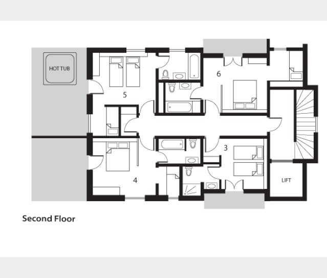(Second floor) - Twin with en suite bath, handbasin and WC. Bunk beds. Balcony with private hot tub. (Minimum occupancy 3 people). Space for a cot.