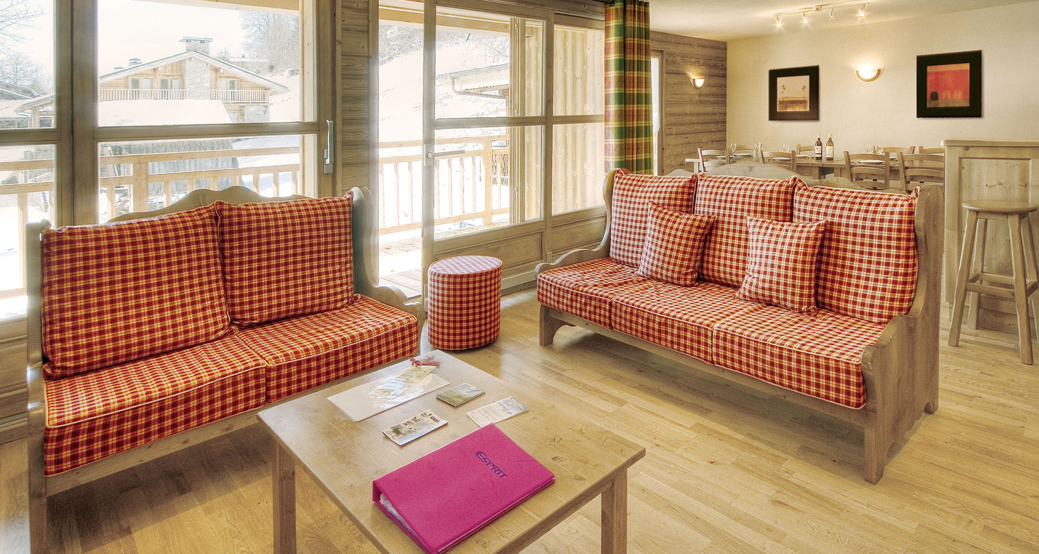 The chalet Martine has a comfortable and stylish interior, with open-plan living / dining areas with attractive log-burning stoves and characterful beams and eaves ceilings, as it’s on the second floor, at the top of the building.
