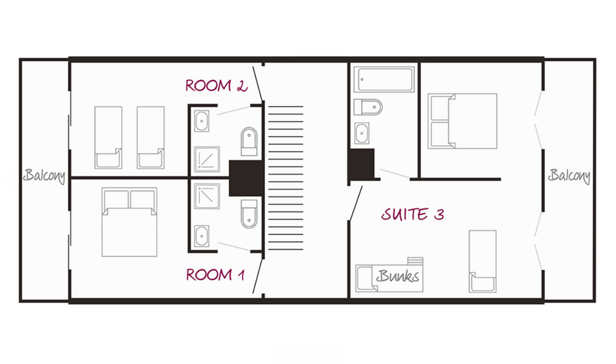 Suite 3 - Sleeps up to 5 plus cot space. This spacious family suite consists of a double bed, a bunk bed and a single bed in a separate room, plus an ensuite with a bath. The balcony can be accessed from both rooms.