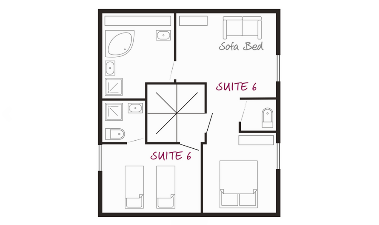 Suite 6 - Sleeps up to 5 plus space for a cot. This top floor, spacious family suite is built into the eaves of Eva. The suite contains a bedroom with a double bed, sofa bed and a large ensuite with a bath and shower. The second room is compact and best suited to children – containing two single beds and an ensuite with a shower.