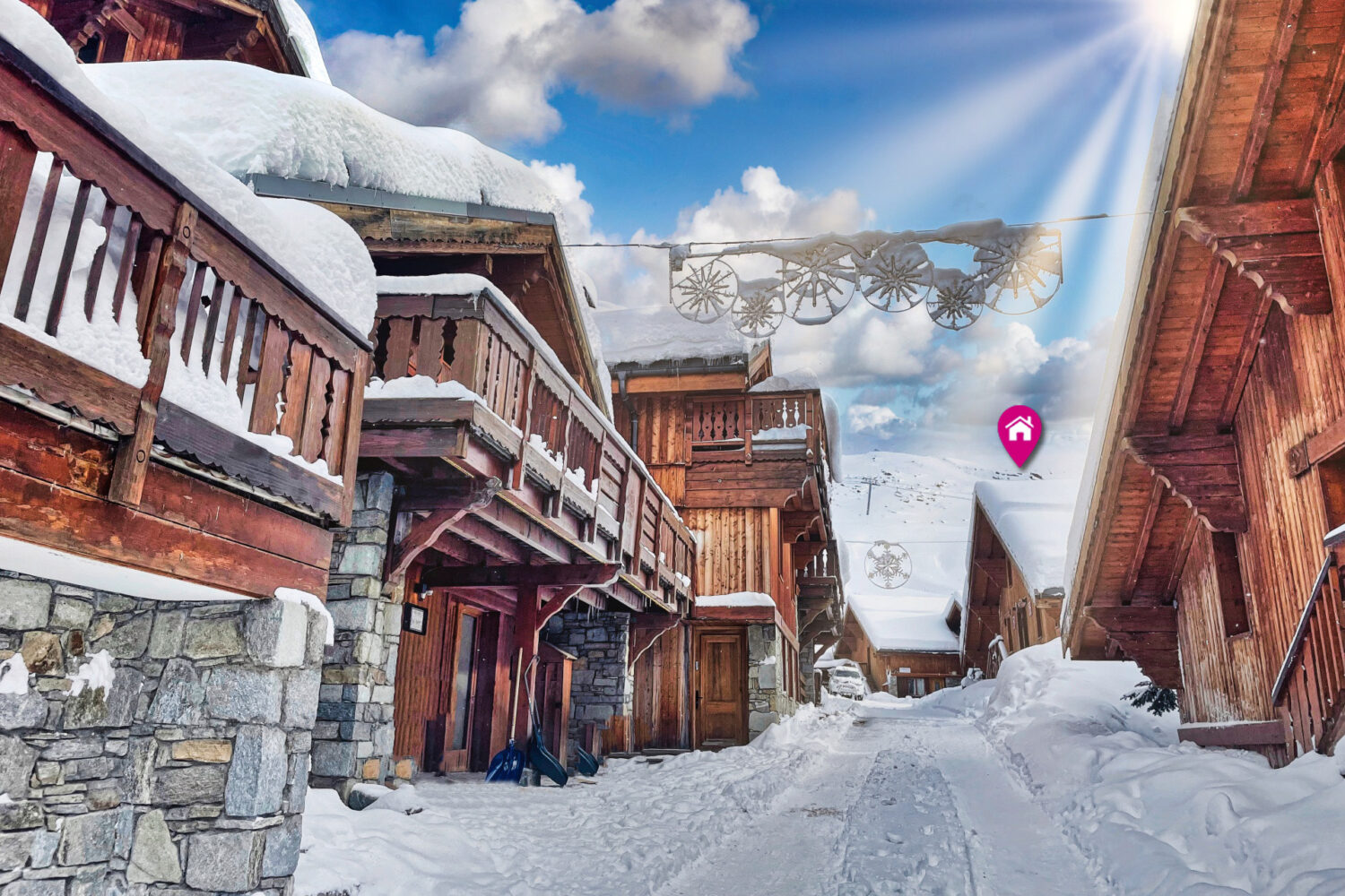 Ski-in / ski-out chalet. Fantastic location, right on the slopes. The blue piste at your doorstep, next to the ski lifts, at 2000m and situated in Les Menuires’ sought-after chalet resort Reberty Village. There is a surprising charm to this area too, with only charming chalets and no appartment buildings, surrounded by sensitive development using lots of stone, slate and wood. Put your skis on at your chalet and you are directly in the very heart of Three Valleys ski area. And at being so high, snow at your chalet is 100% guaranteed here from the 1st of December till the end of April. Ski directly back to the doorstep at the end of a day’s skiing. Fantastic for the keen skier, you can’t get much closer to the slopes. Just outside the front door is where you will find the hot-tub bubble bath and indoor a sauna with shower and WC providing the perfect setting to relax after a long day on the slopes. Ski lessons starts on the easy slopes in front of the chalet. Ideal for children and beginners. And a very short hop from the ski hire shop. A Savoyard style and tasteful restaurant is only 1 minutes’ walk from the chalet with a large sunny terrace sit right on the edge of the piste perfect to enjoy your ‘vin chaud’ while overlooking your kids on the slopes. All six bedrooms have its own full en-suite bathroom with shower, WC and basin. The warm and inviting living and dining room has comfortable seating around a huge open fireplace and a flatscreen TV. From the lounge you can access a stunning south-facing terrace-balcony. It boasts seductive views over the mountains of Les Menuires with a wonderful cosy and retreat like feel. A heated ski room with boot dryers/warmers is directly around the corner at the door right by the piste. And parking is for free at the chalet. Your chalet staff live out, so your privacy is completely guaranteed.
