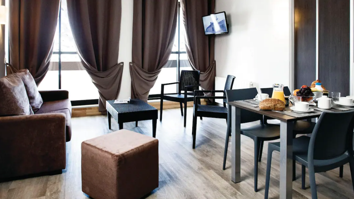 The apartments are split across two sections of the long residence building, separated by shops and a mini market. These modest apartments are decorated with neutral colours and dark wood flooring. There’s a whole range of sizes available, from two-person studios to apartments for six. Each of them comes with a kitchenette with hobs, microwave, fridge, dishwasher, toaster, kettle and coffee maker – so you can prepare breakfast, lunch and dinner whenever you want. And most of them have a balcony, so you can sit out and make the most of the view.