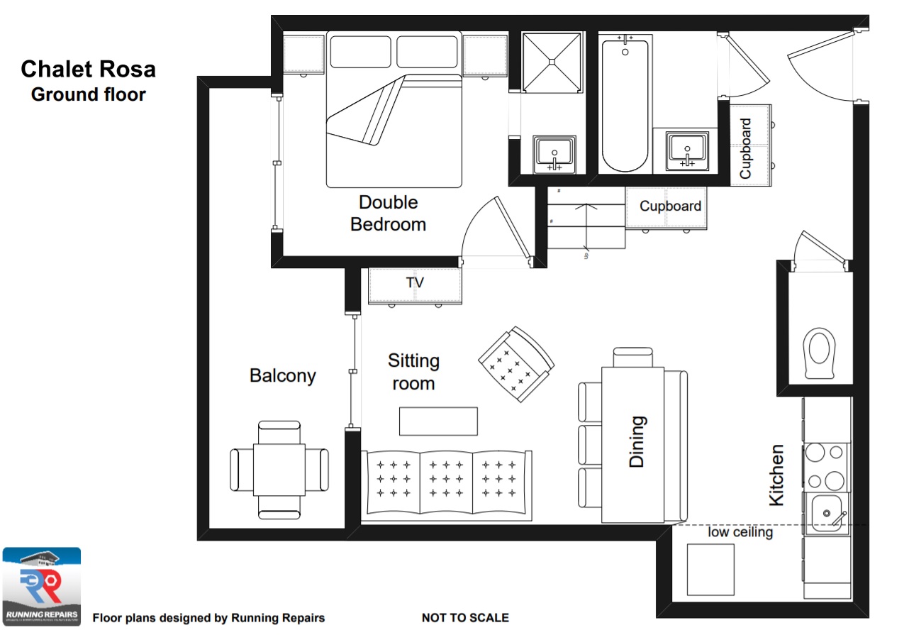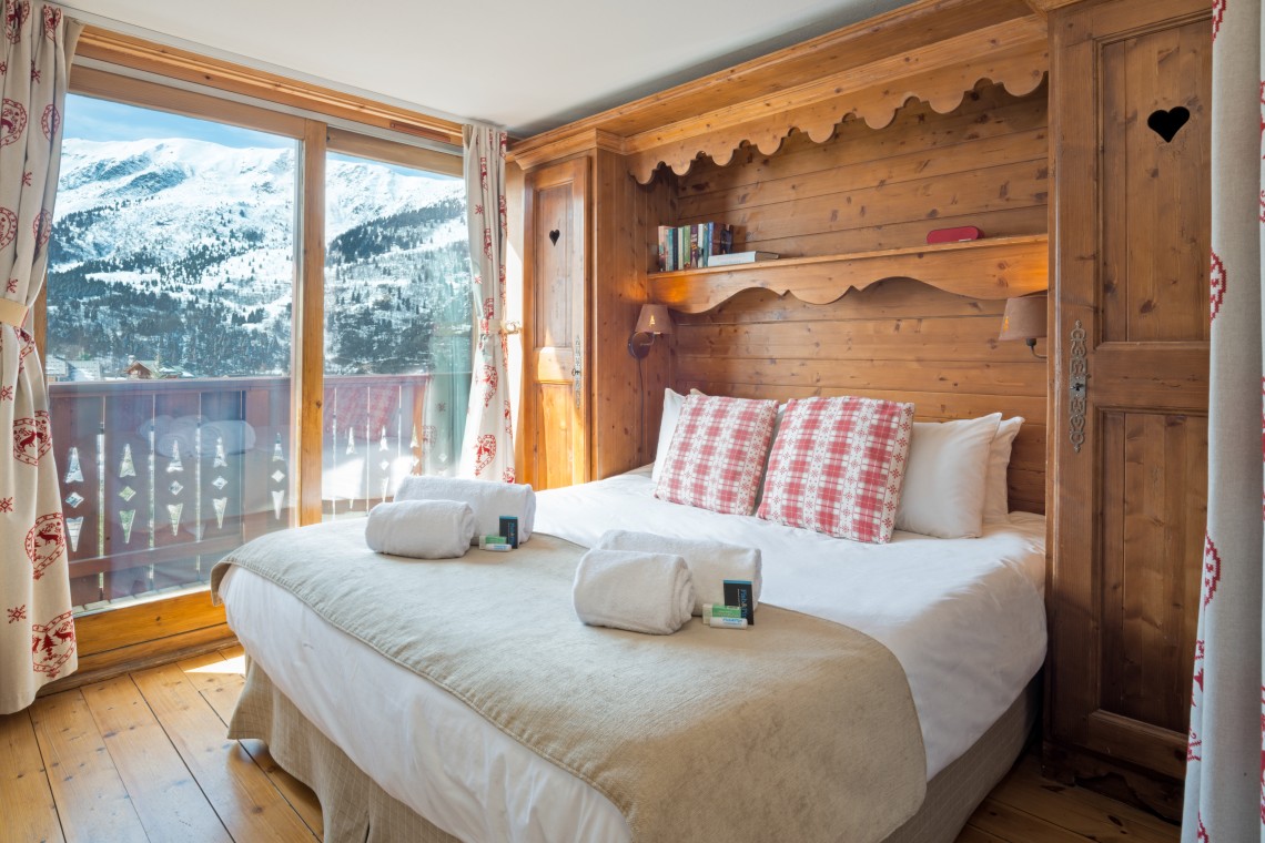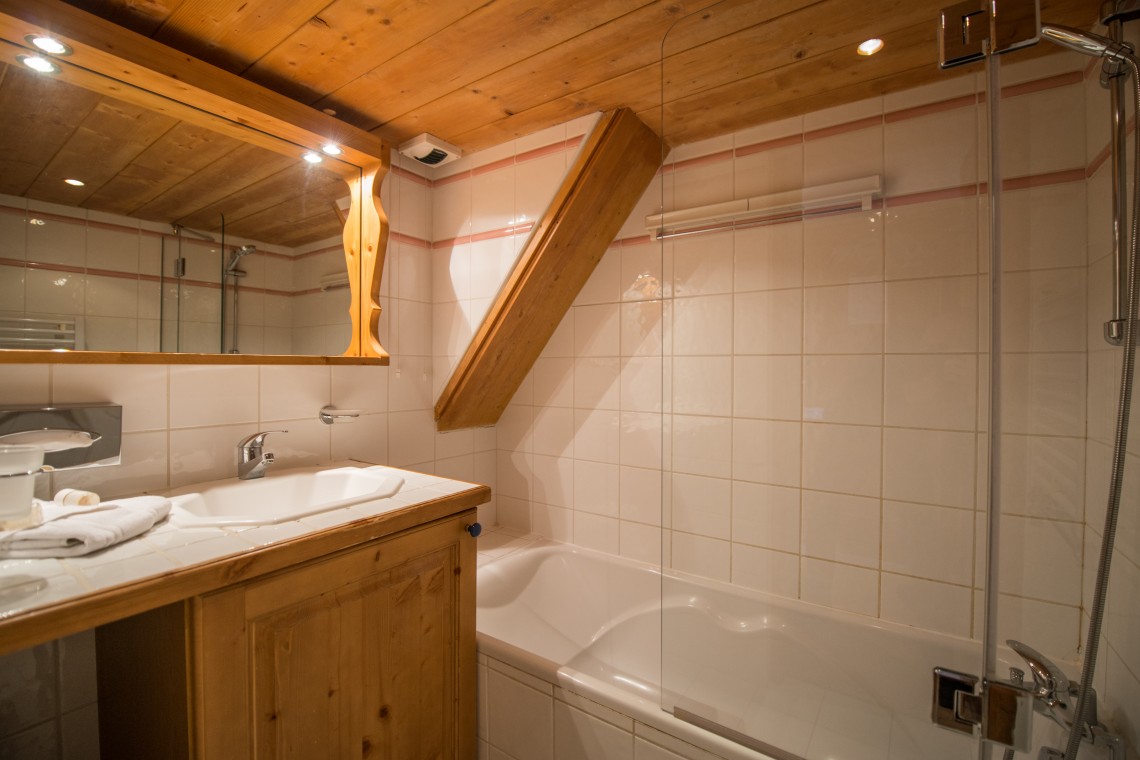 The chalet has an open plan dining / living area, large balcony with amazing views across the Meribel valley. There is a double room downstairs with an ensuite bathroom with bath and vanity unit and a separate WC in the hall. Upstairs there are two good sized rooms; one double room with plenty of storage and balcony with stunning views, there is one further twin room. The bedrooms upstairs share a bathroom which consists of a sink and shower.