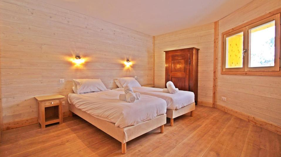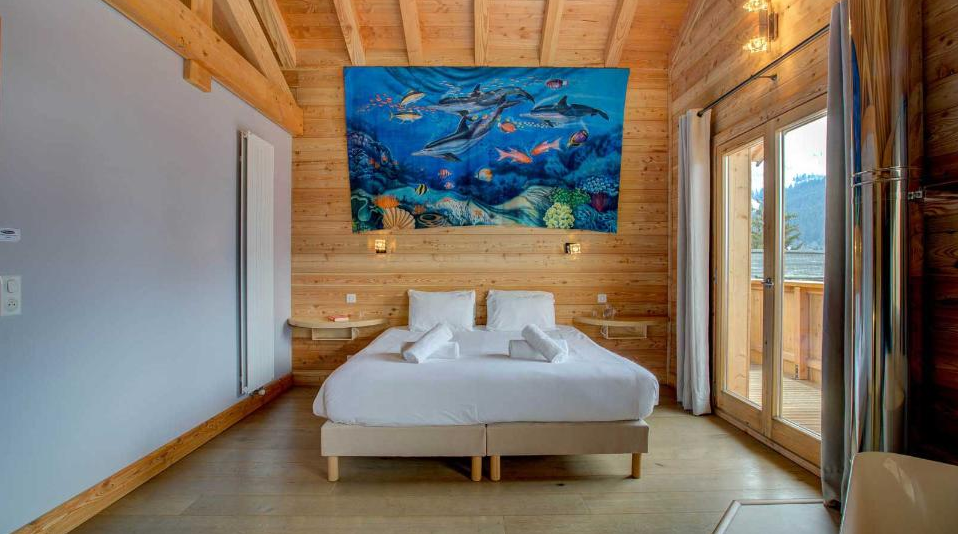 Relax with the views- The glamourous chalet hot tub, commanding position on the front balcony, welcome you at home after a long day skiing, helping to rest your limbs whilst taking in some sublime unobstructed mountain views. All main bedrooms enjoy similar valley views, allowing you to wake up and breathe in the mountains from your hillside home. All the bedrooms are spacious and come with the added benefit of en suite facilities, bedroom 3 is located directly on the entrance floor, while bedrooms 1 and 2 are on the lower floor. On the top floor Bedroom 4 floor is an ideal family room, almost an apartment on its own, made up of two separate rooms, the first one with a large double bed and a bathtub and a second room suitable only for children with 2 single beds, with a shower room and a separate WC room located directly on top of the stairs and separating the two bedrooms. Chalet Aline benefits from a ski boot room with boot warmers and free WiFi.