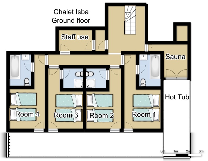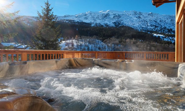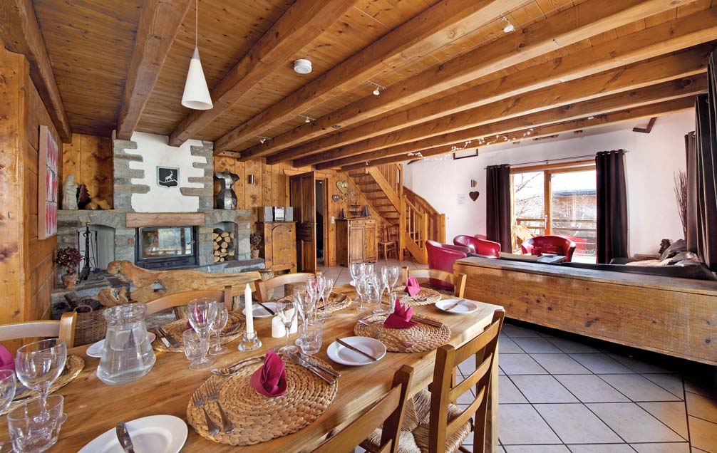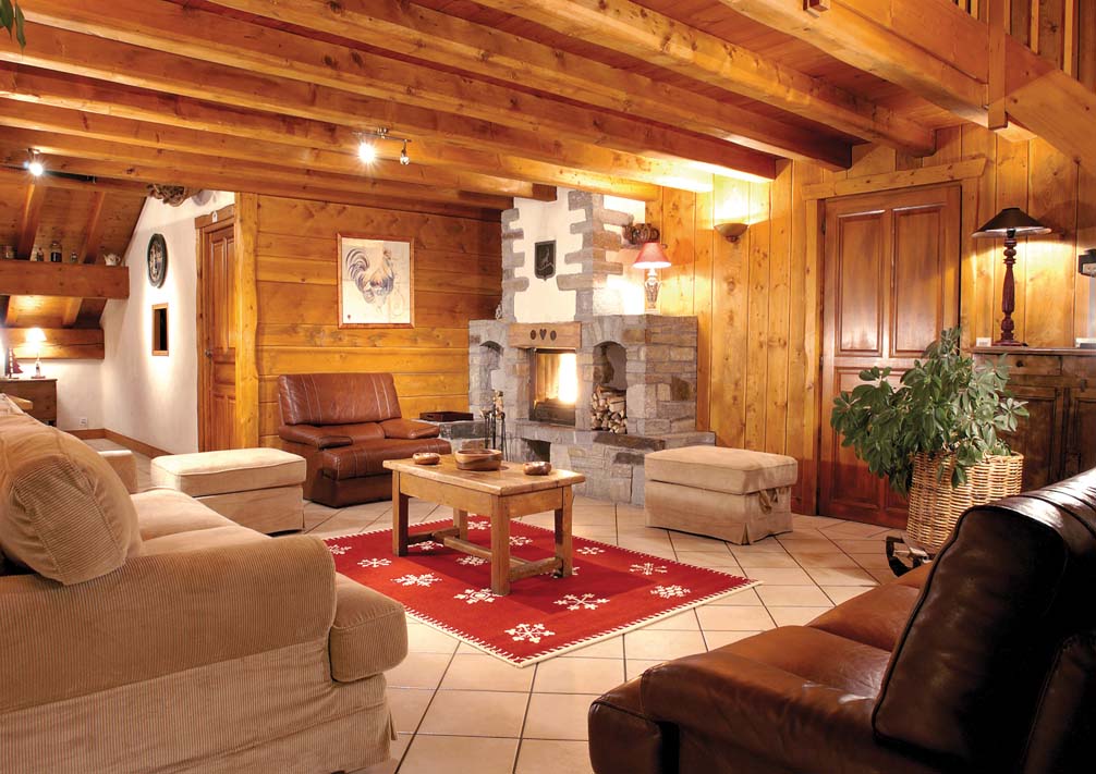 The main reception rooms are full of character with authentic wooden paneling and beams and a log fireplace, as well as a further cozy lounge on the mezzanine level above. The chalet is built in to the hillside so the entrance is from the back on the second floor. This allows splendid views from the chalet, particularly from the hot-tub!