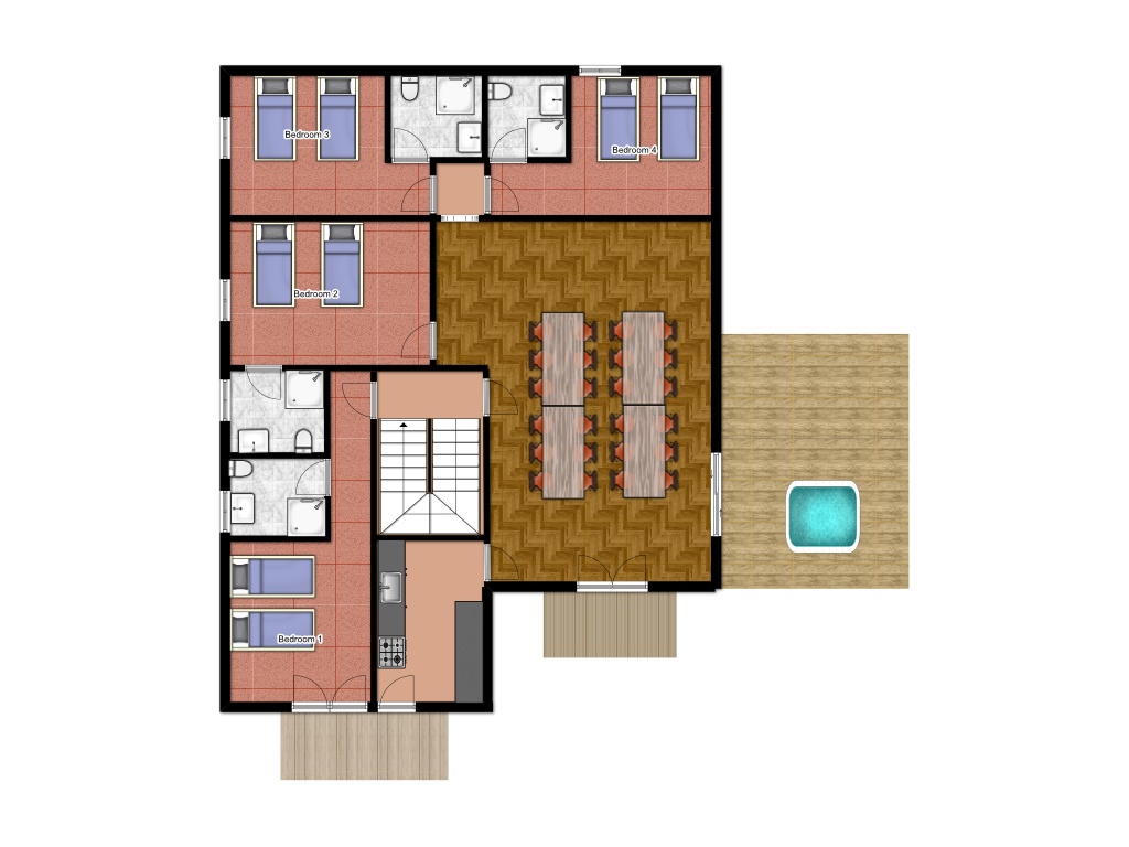 This super freestanding property provides perfect comfortable accommodation for up to 24 guests, therefore its ideal for large groups of friends, families getting together or for smaller groups wanting to meet like-minded people on their well-earned annual ski holiday. The living room is situated on the second floor with a wonderful open fireplace and the dining room leads to a lovely open sunny terrace on which to enjoy a chilled glass of wine at the end of a hard day on the slopes before sinking into the hot-tub to soak those aching limbs! All the bedrooms offer comfortable, although relatively basic accommodation and each has ensuite facilities.