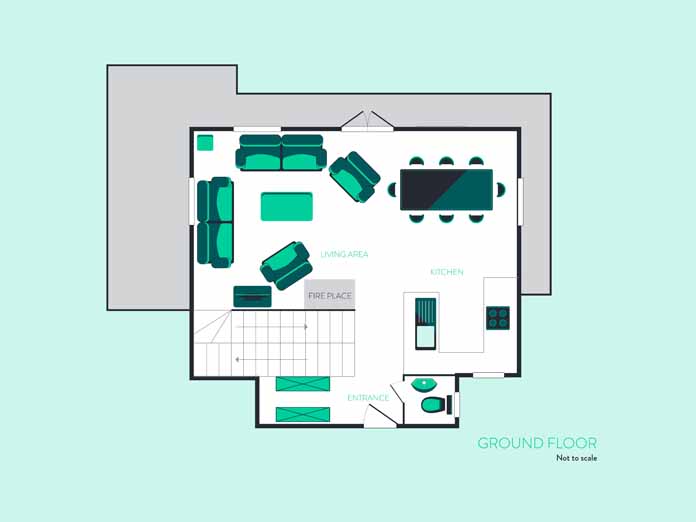 ground floor: Open-plan living/dining area with balcony. Separate WC. Steep wooden staircase from living area to top floor.