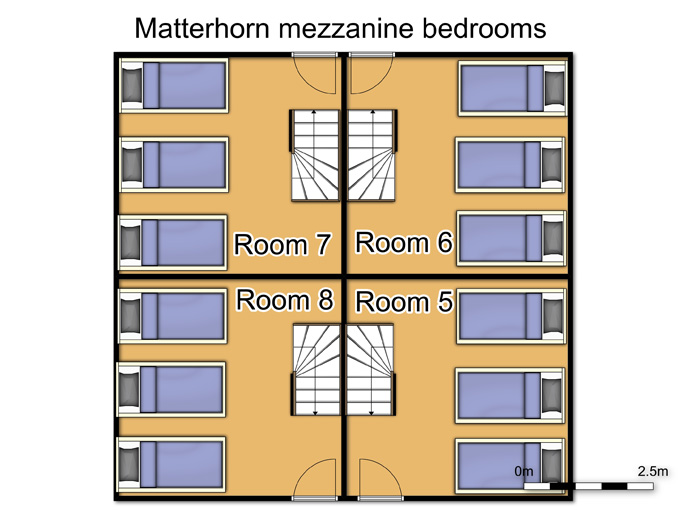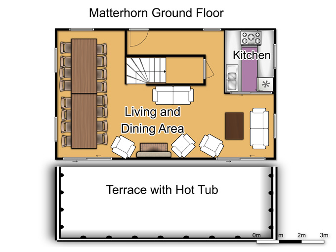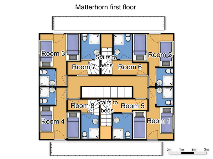 The eight bedrooms open off one central landing, and all have their own private en suite shower, wc and balcony. The comfortable and attractive open-plan living / dining-room sets the scene for a convivial chalet atmosphere.