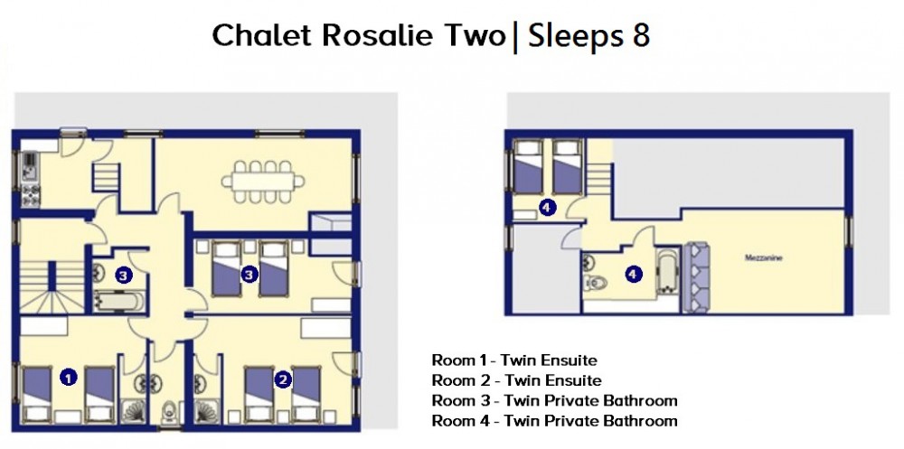 Chalet Rosalie Two is a traditional catered chalet, it's bright, spacious and very comfortable. There is a stone chimney corner fireplace in the open plan lounge and dinning area. Some of the bedrooms have southerly facing balconies with stunning views over the Meribel Valley. There are two twin bedroom with their own private bathroom facilities and another twin with an en-suite shower, basin & WC. There is also a mezzanine area for relaxation. The chalet shares the boot room and exit with it's neighbor Rosalie One, both are separate chalets and have their own balconies, but for larger groups, the chalets be booked together to accommodate upto 14 people.