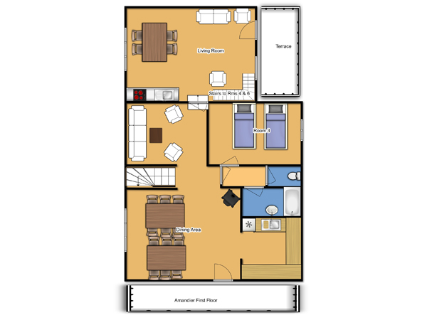 There are two separate lounges each with a Tv. Canapés and apéritifs are served in the lounge on the first floor which is just next to the dining room with its welcoming wood burning stove. The balcony has some great views overlooking the slopes of Serre Chevalier. The nearest ski lift is the Pontillas cable-car which is a 10 minute walk although there is a free minibus service to whisk you to the Frejus lift and ski school meeting place in the centre of Villeneuve at the start and then end of the skiing day. The centre of Villeneuve itself is approximately 10 minutes' walk and it is here that you will find a good selection of restaurants, bars and shops.