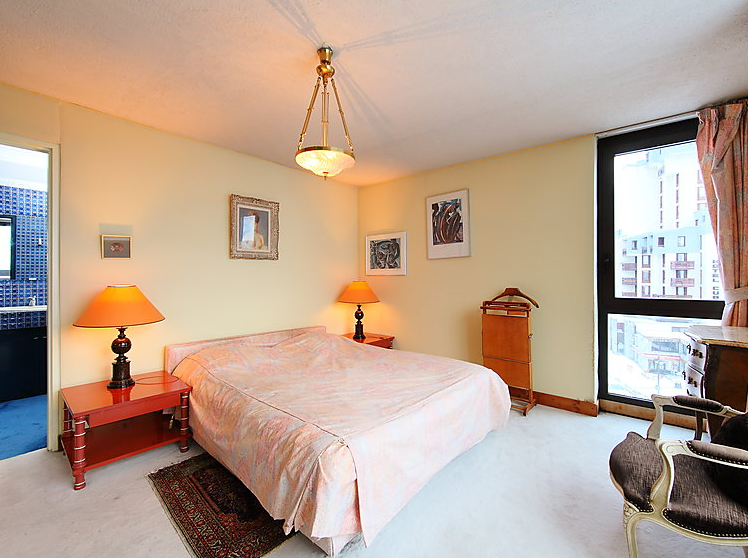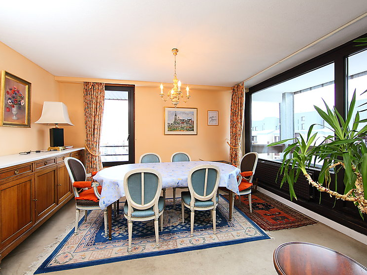 5-room apartment 120 m2 on 2 levels on 6th floor. Spacious, very comfortable furnishings: open living room with digital TV, flat screen, video, radio, hi-fi system and DVD. Dining room. Exit to the balcony, south facing position. Large kitchen (oven, dishwasher, 4 ceramic glass hob hotplates, microwave, freezer, electric coffee machine, steamer). Sep. WC. Upper floor: 1 room with 1 double bed (160 cm), bathroom and double hand-basin. 1 room with 1 double sofabed (2 x 80 cm), library. 1 room with 1 x 2 bunk beds (80 cm). 1 room with 1 double bed (140 cm). Bathroom, sep. WC. Large terrace 20 m2, south facing position. Deck chairs (2). Marvellous panoramic view of the mountains and the ski run. Facilities: washing machine, dryer, iron, hair dryer. Please note: non-smokers only.