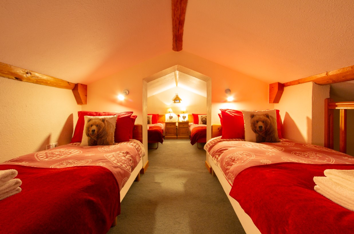 The chalet-hotel is spread over three floors with 15 generously sized rooms (nine doubles / twin; two triple; four family/quad). All rooms have a flat-screen TV and most rooms have access to a balcony overlooking the snowy village and lake.