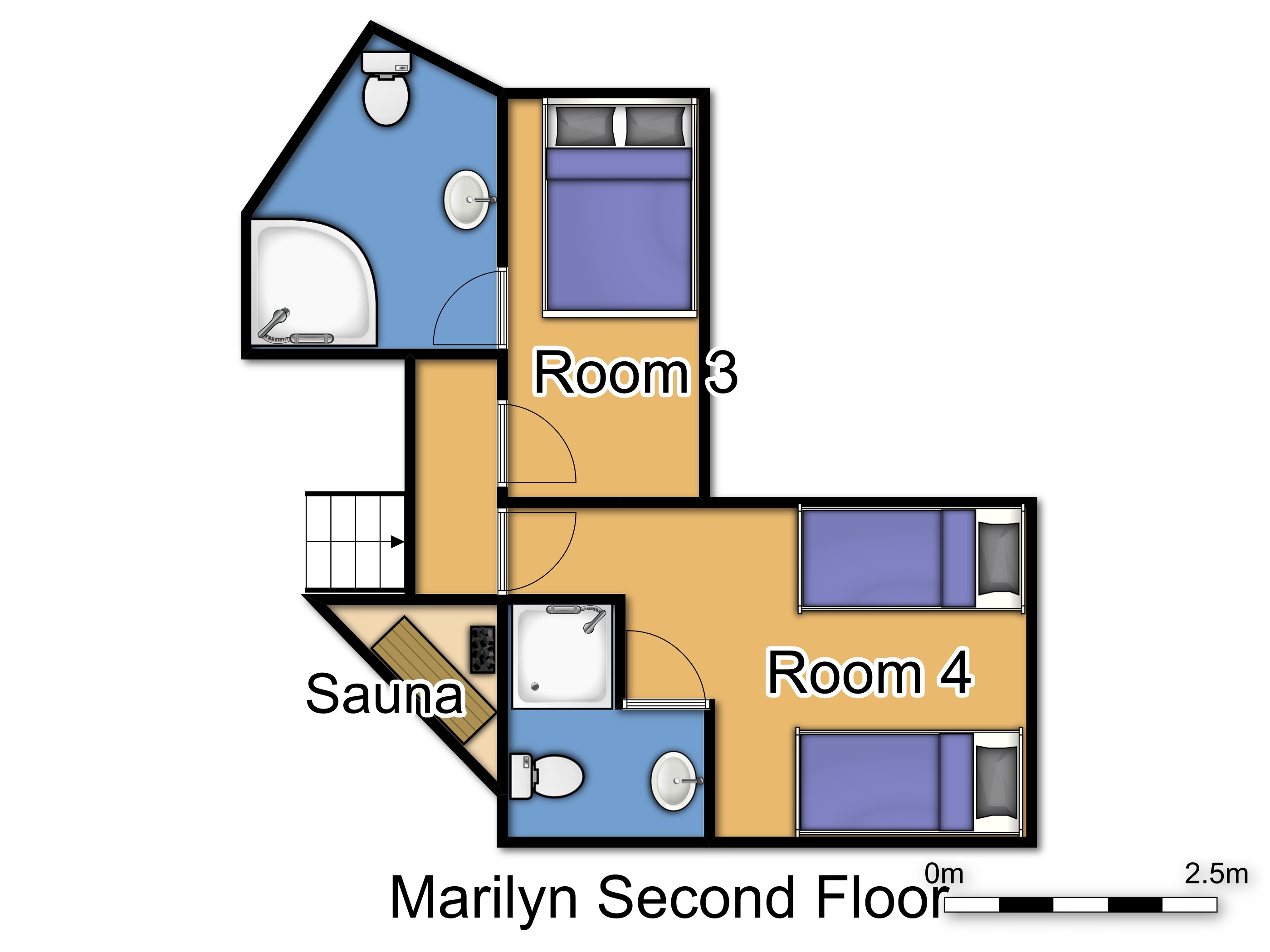 Built into the hillside, the layout features the entrance and small sauna on the first floor, with the living areas below and the cosy bedrooms on the first and second floors.