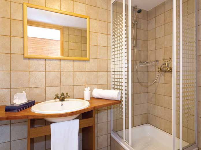 ground floor: living room with dining area and TV, sauna. 3 twin bedrooms with en suite shower and WC (1,4&5). 2 double rooms with extra single bed, en suite shower and WC (2&3). Triple room with 3 single beds, en suite shower and WC (6). Rooms 4,5&6 only have a small window.