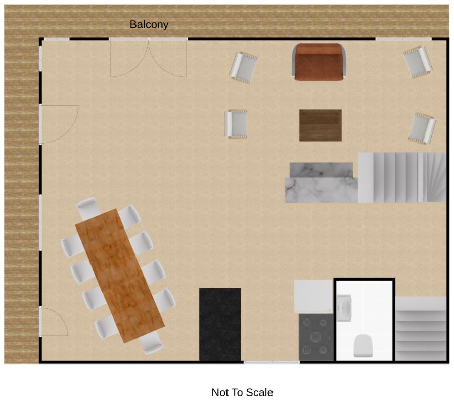 Mezzanine: A cozy space with seating, TV (Chromecast), and games.