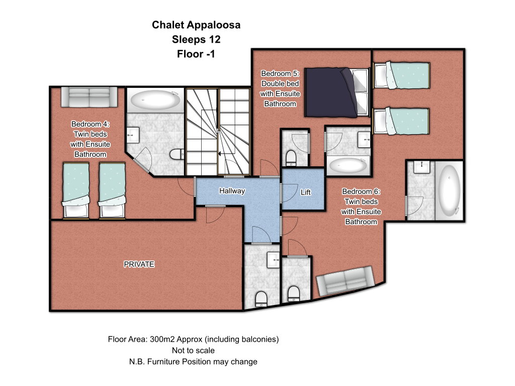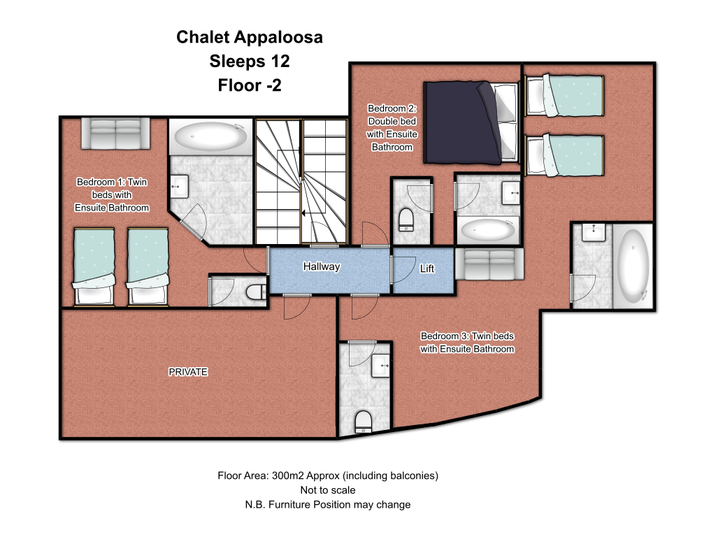 Unusually after the ground floor in this chalet, you then head down rather than up. On the lower first floor you'll find three bedrooms with twin beds, each with its own balcony and two of which have en-suite bathrooms and WC and the third which has an en-suite shower room and WC. There is a fourth bedroom on this level which has a large double bed, balcony and en-suite bathroom with WC. On the lower second floor there are two bedrooms with twin beds, and one bedroom with a large double bed, each with its own en-suite bathroom, WC and balcony.