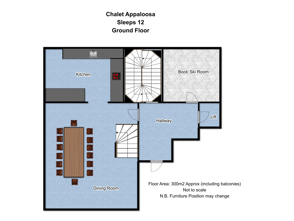 Entrance to the chalet is on the ground floor, where you'll find a spacious ski and boot room complete with heated boot drier, so no need to worry about cold toes when you hit the slopes each morning. There is a large dining room, with plenty of space for fourteen guests. The dining room has been beautifully furnished with elegant chandeliers above the table the focal point of the room. The kitchen is separate, but next door to the dining room. It's a semi-professional kitchen with stainless steel work surfaces and fully equipped with oven, hob, dishwasher, a large fridge, freezer, microwave, kettle, toaster, nespresso machine and coffee percolator, so you should have everything you require to rustle up a feast for all your family and friends. Outside the kitchen and dining room is a spacious balcony, a great spot to enjoy aperitifs and nibbles before dinner and enjoy the stunning views of the surrounding area whilst the sun sets. There is a mezzanine level on the ground floor, where you'll find a large and spacious living area with a roaring log fire and wonderfully comfortable sofas.