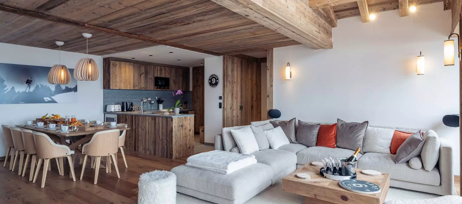 Upon entering the chalet on the first floor, you'll find a spacious living room with plush sofas arranged around a crackling fireplace, the perfect spot for pre-dinner drinks. The living room opens onto a terrace offering breathtaking views of the surrounding mountains.