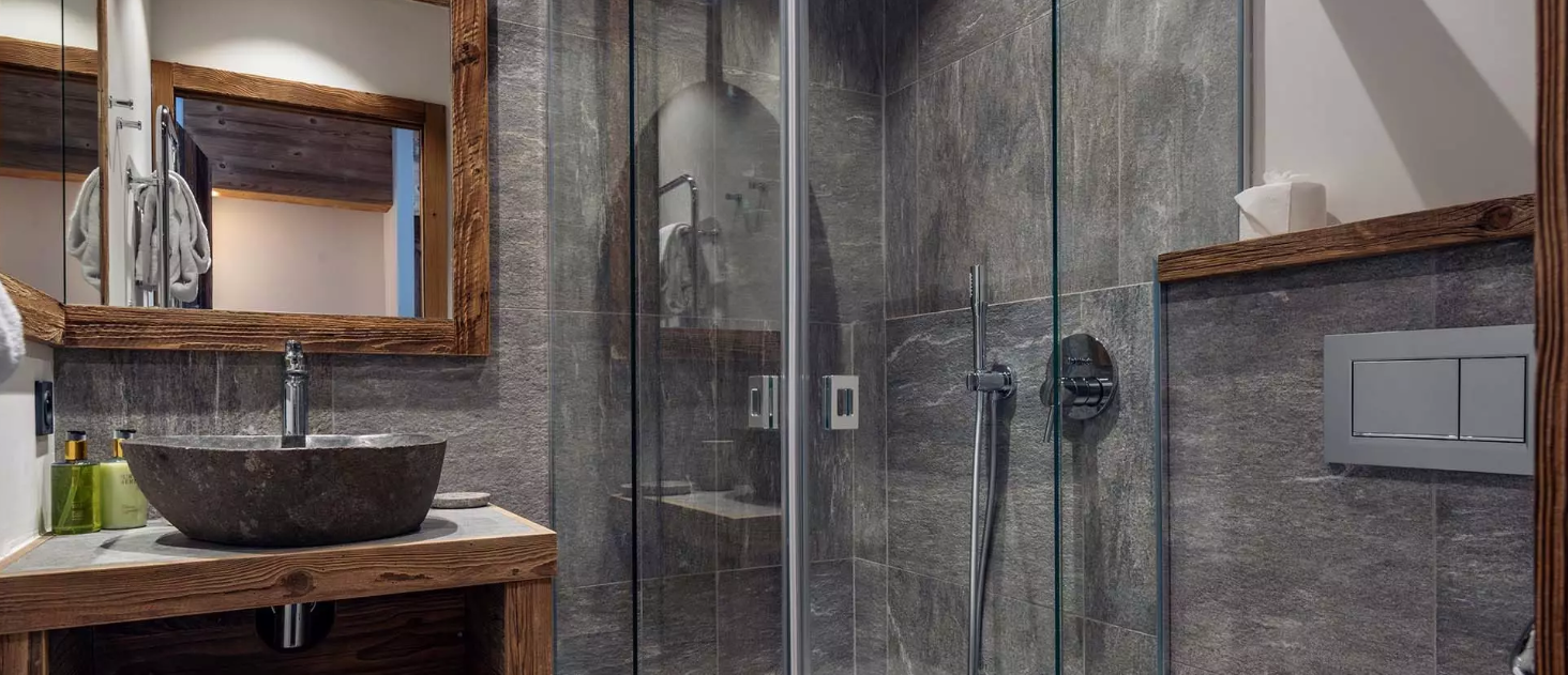 The chalet's traditional alpine wood and stone architecture has been seamlessly blended with luxurious modern touches, creating an idyllic space for you to retreat to after a long day on the slopes. Entrance to the chalet is on the first floor, where you will find the spacious living room, featuring plush sofas arranged around a crackling fireplace, the perfect spot for pre-dinner aperitifs. The living room opens out onto the terrace, which offers magnificent views over the surrounding mountains. On the same level is a fully equipped kitchen and a large dining area, so you can opt to stay in and entertain friends and family with a home cooked meal in the comfort of your own chalet. There are 4 cosy double bedrooms sleeping up to 8 guests, all with their own ensuite bathrooms. The first bedroom can be found on the first floor, with the remaining 3 bedrooms on the second floor. There is also a private ski room on the first floor so you can safely store your kit during your stay, and an undercover parking space for those driving to the chalet.