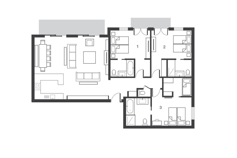 This new building has timeless interior design with classic furnishings. No 4 consists of 3 twin/double bedrooms each with en suite shower, hand basin and WC. 2 bedrooms have a balcony and 1 bedroom has an additional bunk bed making it the family room where children taking a bunk are half price. Open plan living / dinning area comes complete with a water vapour fire.