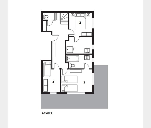 (Level 1) - Twin bedroom with balcony en suite bath, handbasin & WC. Balcony. Space for a cot.