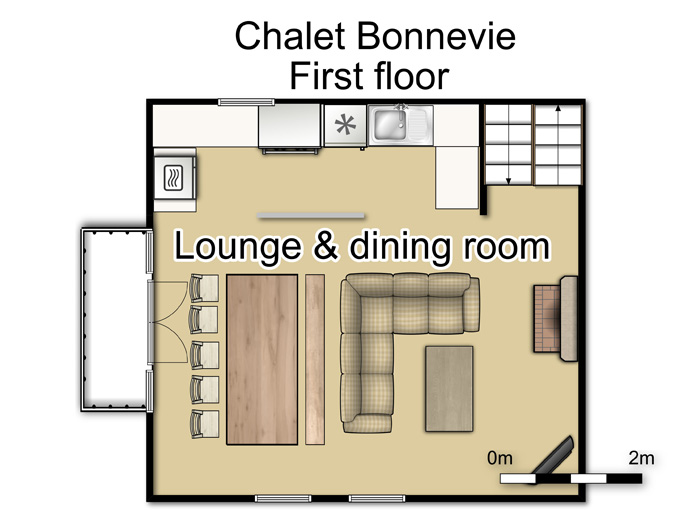 The chalet is on three levels, of a very good, comfortable and attractive standard, and features a good-sized living-room with log fire, comfy sofas, TV / DVD and CD player so bring your favourite films and music.