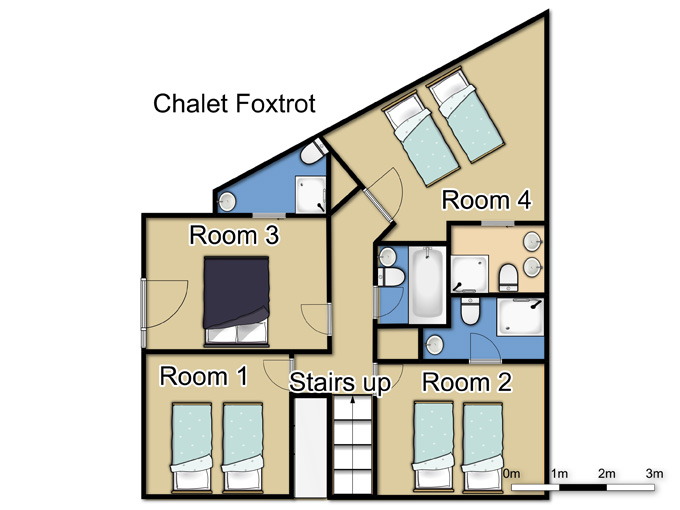The Chalet Foxtrot bedrooms are well planned, and the bathrooms are particularly well-fitted, with fresh white tiling, chrome fittings and mirrors, and heated towel rails.