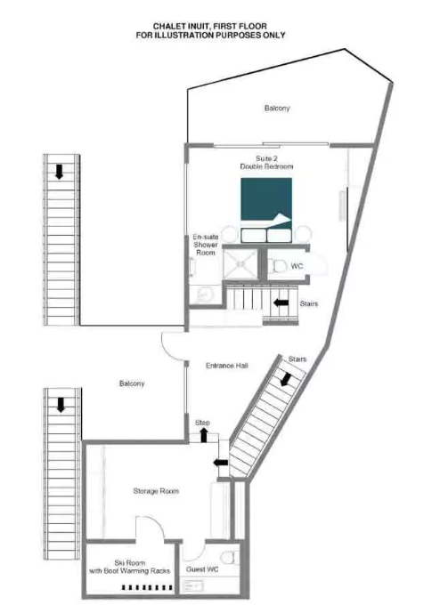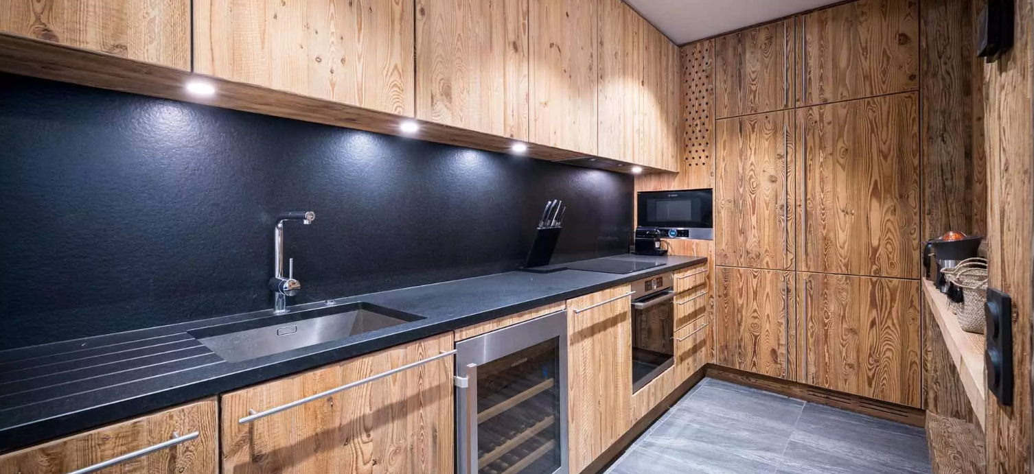 Entrance to the chalet is on the first floor, which houses a conveniently located ski room with a boot heater, so you can easily grab your kit and slip your feet into a warm pair of boots as you dash out to the slopes in the morning. Stepping down to the upper ground floor you'll find an inviting open plan kitchen and dining area with a dining table which seats 8, perfect for entertaining large groups or families. The kitchen is fully equipped with everything you would need to prepare a big pre-ski breakfast or enjoy a relaxing dinner after a long day on the slopes.