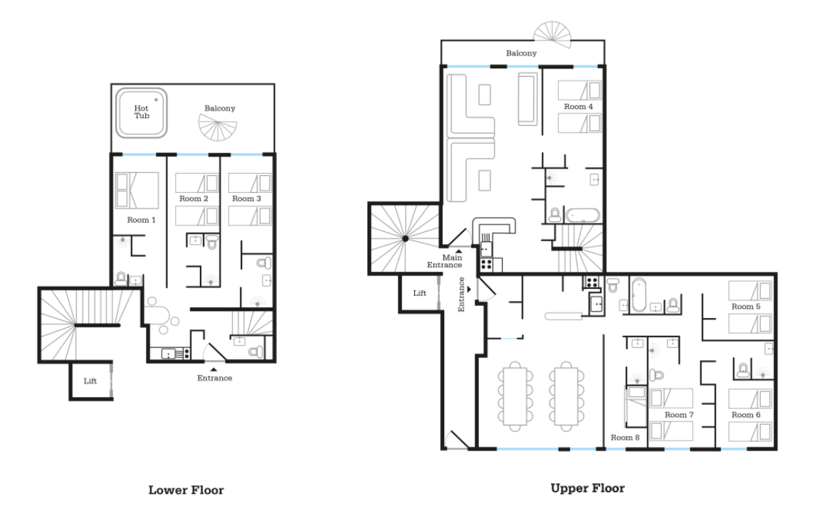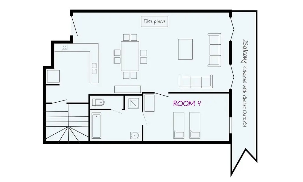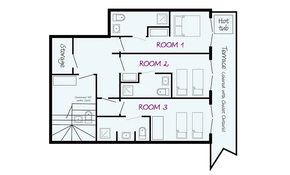 This chalet was built and fitted out to a very high standard, in a typically Alpine style. The Chalet Quebec has a hot tub on the balcony and take groups of up to eight guests in twin rooms with full en-suite facilities. The lounge area as fireplace and smart TV with UK channels and Netflix and there is free wifi in the chalet. There is a large ski & boot locker storage area with under-floor heating and the various chalets in the building are jointly served by a lift and large spiral staircase.