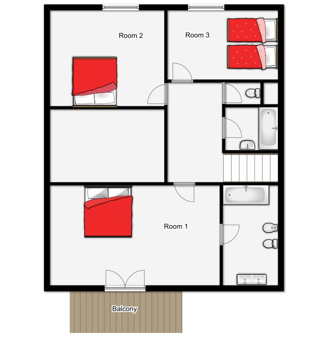 Room 1 - Master bedroom with double bed, balcony and large bathroom with bath, twin basins & WC