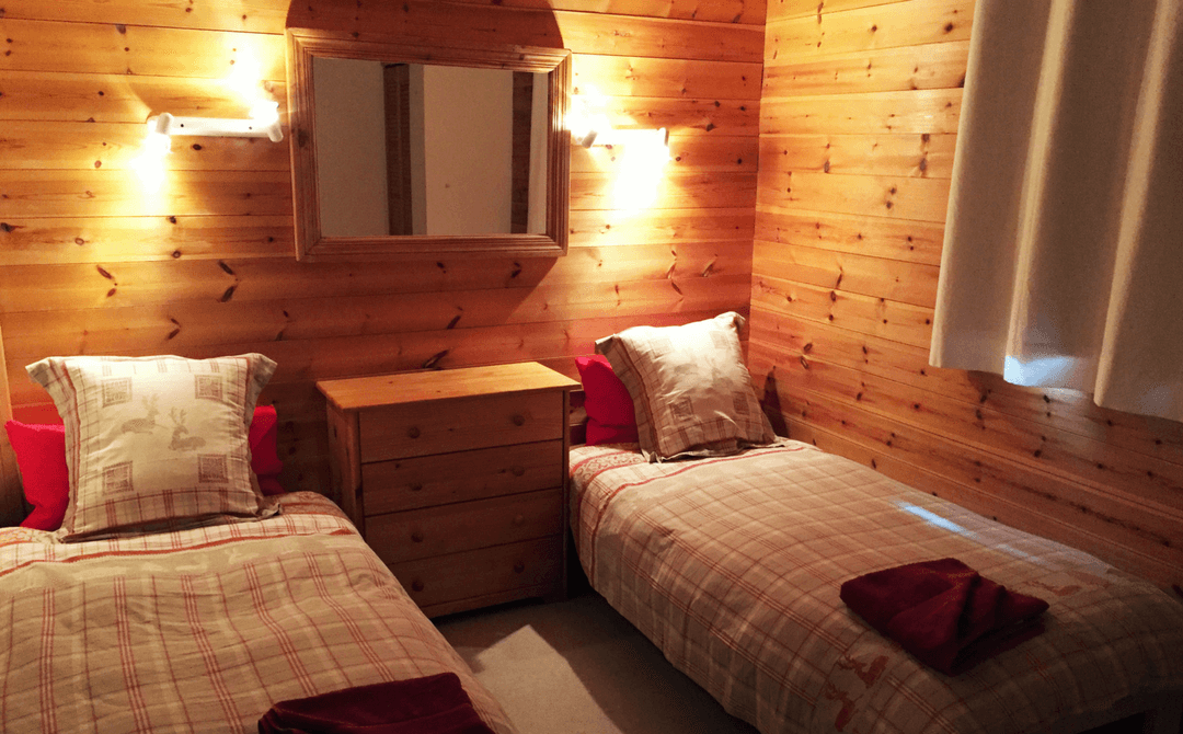 Room 6 - Good sized twin room with high ceilings. Accessed from the lounge & dining area. There is a window looking out to the front of the chalet. En-suite bathroom, bath with shower unit.