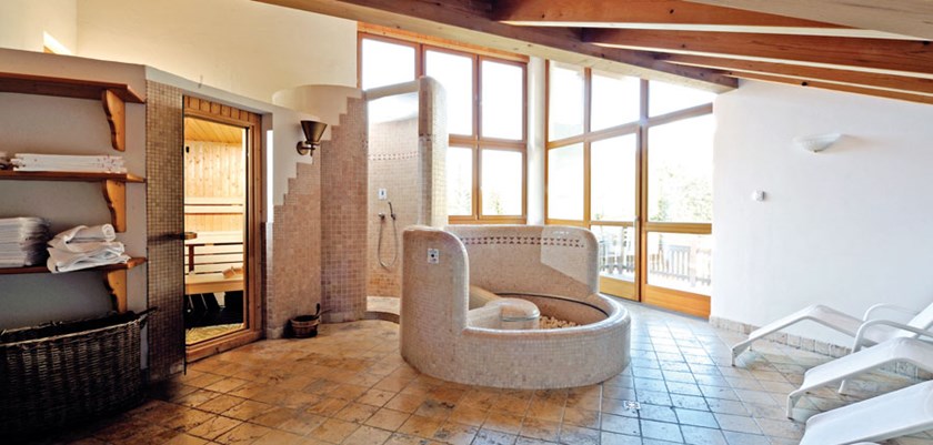 Lounge, sauna and relaxation area with Kneipp therapy path - with panoramic views of the Sasso Croce Mountain.