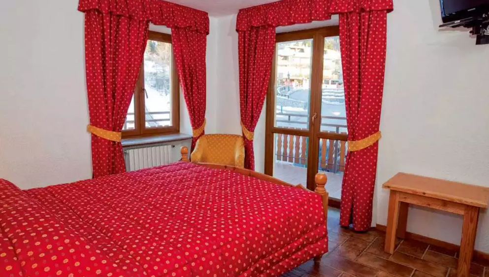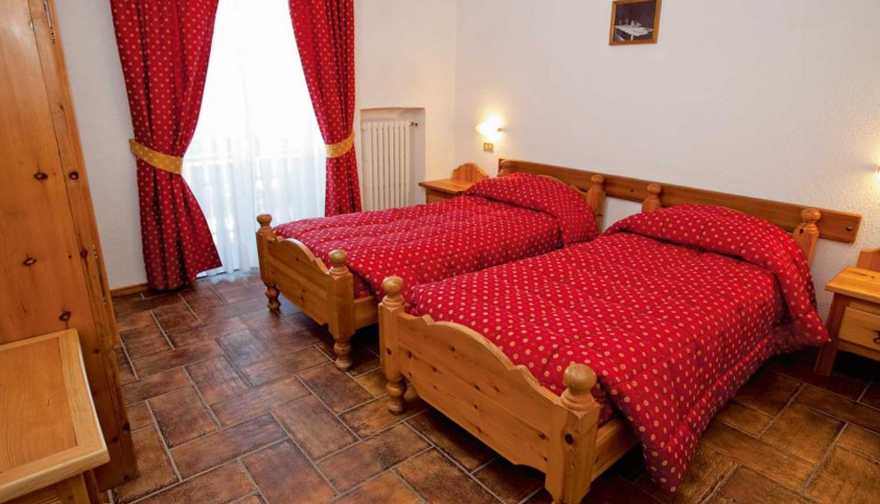 The 18 rooms here are comfortable twins finished in a traditional style, with bright reds and lots of lovely alpine wooden details everywhere. Some of the rooms come with an extra bed perfect for a little one, as do the triple rooms.