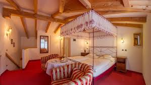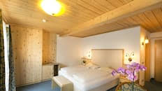 As for the rooms, they’re decorated in classic alpine style, with wood panelling and warm colours. And each one has a balcony so you can make the most of the panoramic views.