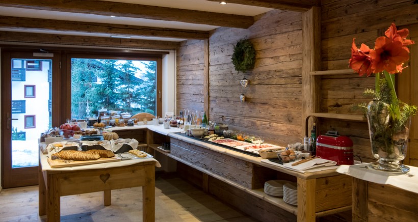 The breakfast room is decorated in a chalet style with a warming fireplace. It is a lovely atmosphere to start the day in.
