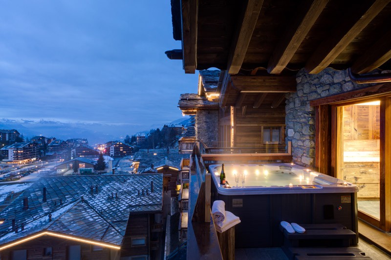 Be transported to the pages of the most luxurious property magazine as you walk through the door of this exquisite chalet. Experience perfection; from the top quality fixtures and fittings in the bathrooms and bedrooms, including luxuries such as blue tooth speakers in every bedroom, to the high end look and feel of the living areas. The chalet boasts two living areas with fire places and a snug, complete with a flat screen TV and DVD player, offering oodles of space for you and your party to relax in. Panoramic views of the Rhone valley and the Haute d’Cry mountain range can be enjoyed from the large picture windows in the two living areas; this is Swiss chic at its best. Every detail has been designed with the skier in mind from the heated ski and boot room to the relaxing outdoor hot tub on the terrace. The chalet also boasts from 2 covered car parking spaces. Offering a unique Alpine experience, this is a chalet you will really look forward to returning to at the end of the day.