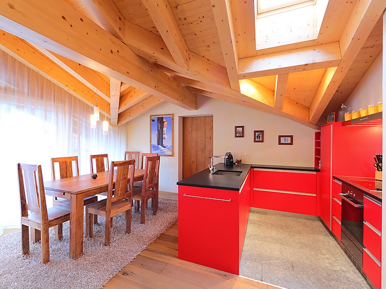 8-room apartment 255 m2 on 2 levels on 3rd floor. Luxurious and cosy furnishings: 2 double bedrooms, each room with 1 double bed. Living/dining room with open-hearth fireplace, TV, radio, CD-player and DVD. Open kitchen (4 hot plates, oven, dishwasher). 2 baths/WC, whirlpool. On the lower ground floor: 3 double bedrooms, each room with 1 double bed. 1 room with 2 beds (90 cm, length 200 cm). 2 baths/WC, whirlpool. Balcony 14 m2, south facing position balcony 12 m2, south facing position. Balcony furniture. View of the Matterhorn. Facilities: safe, hair dryer. Internet (WiFi, free). Please note: non-smokers only. No pets allowed. 2 Duplex apartments with a connection door.
