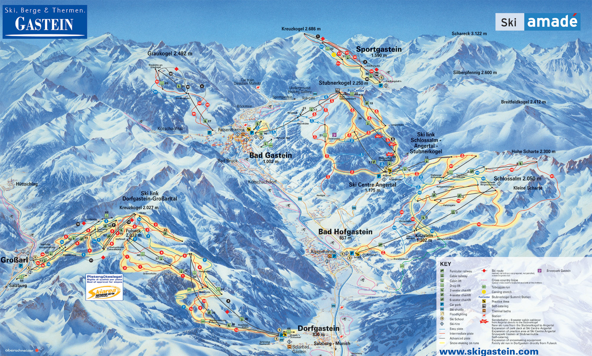 Bad Hofgastein is part of the Gastein ski area with 250km of slopes it is amounts the biggest in Austria. The Gastein area is part of the much larger Ski Amadé area with 860km of pistes it is the largest in Austria. The Gastein area is made up of 4 sections: (1) Schlossalm - Angertal – Stubnerkogel, 860m to 2300m, (2) Sportgastein 1590m to 2700m, (3) Graukogel 1079 to 2007m, (4) Dorfgastein – Großarltal 850m to 2003m. Each of these areas offers different terrain and is better suited for different type of skier or snowboarders.